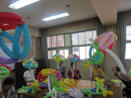 定番の犬から、花、傘まで、何本もの風船でいろいろな形の作品ができました。最後は教頭先生も参加しました。