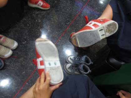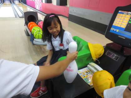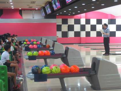 シューズ底の工夫を教えてもらいました。ボーリングのピンに実際にふれ、その大きさを体感しました。そして、ルールやマナーを守ることの大切さを、子どもたちに分かりやすく教えてもらいました。どの子も真剣に聞いていました。