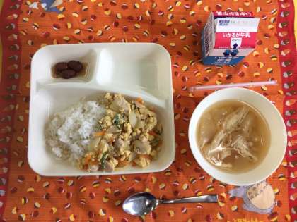 親子丼、とうがんのすまし汁、金時豆の煮もの、牛乳