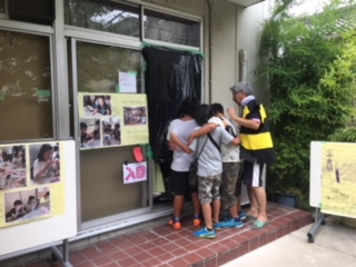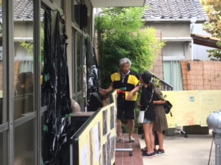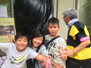 おばけやしきの入口で案内してくれているのは、ゲゲゲのきたろうに扮した町会長さんです。