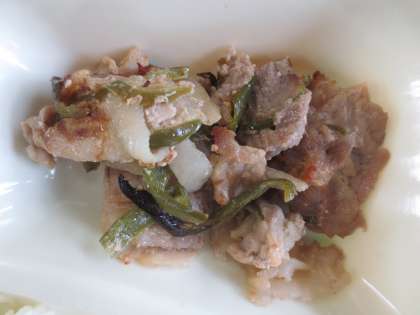 豚肉、ピーマンを砂糖、料理酒、こい口しょうゆ、梅肉で下味をつけ焼いています。