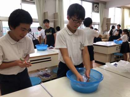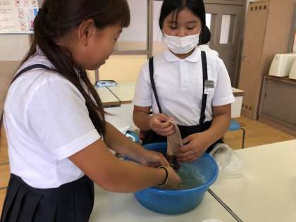 6年生は家庭科の学習で自分のくつ下を洗う学習をしました。