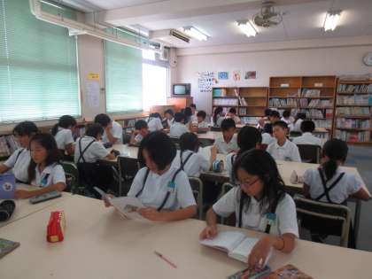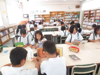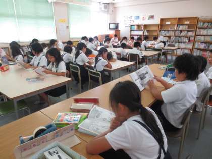 図書室で個々に興味がある本を、しっかりと読んでいます。朝の読書タイムと同様に読書時間を大切にしています。