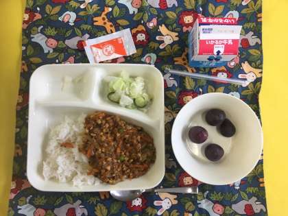 大豆入りキーマカレー(米粉)、グリーンサラダ(ノンエッグドレッシング)、ぶどう(巨峰)、牛乳