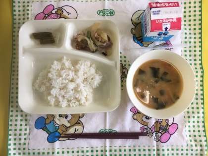 豚肉の甘辛焼き、みそ汁、オクラのおかかいため、ご飯、牛乳