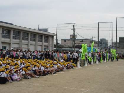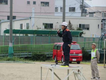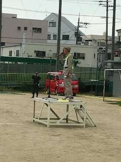 越智警防副署長の講評と、川端理事長の挨拶がありました。天候が心配されましたが、無事に予定通り実施されました。巽南地域の皆様、区役所、消防署、中学校、小学校それぞれの連携と協力で無事に終えることができました。ありがとうございました。
