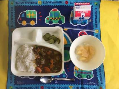 子どもに大人気のカレーライスです。9月は小麦アレルギーの児童も食べられる米粉のカレールウを使っています。