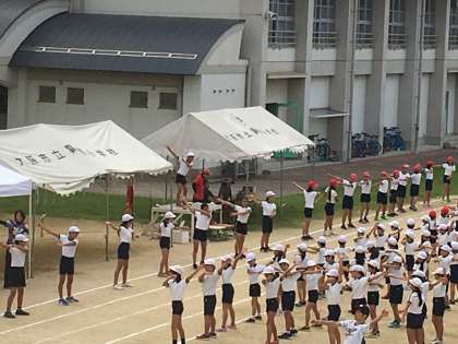 ラジオ体操の様子です。みんな指先まできれいに伸ばして体操していました。