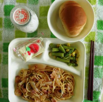 シーフードスパゲッティ、グリーンアスパラガスのサラダ、黒糖パン(小)、牛乳