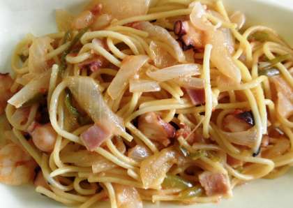 えび、たこ、ベーコンの入ったスパゲッティです。
