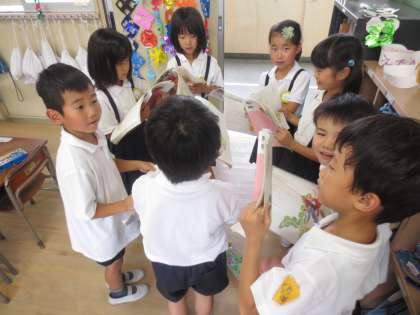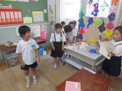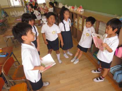 グループで動きも加えて、お話を読み合っています。毎日の音読がしっかりできているので、よく声が出ていました。