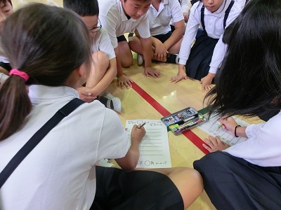 集会委員会の人が言う3つのキーワードを元に班のみんなで相談しながら考えています。