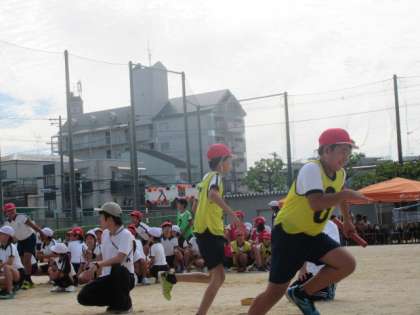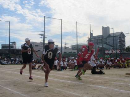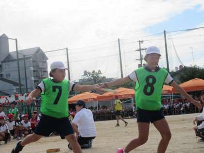 5年生の「覇団継走(バトンけいそう)物語」です。抜きつ抜かれつ、白熱した勝負が繰り広げられました。