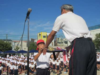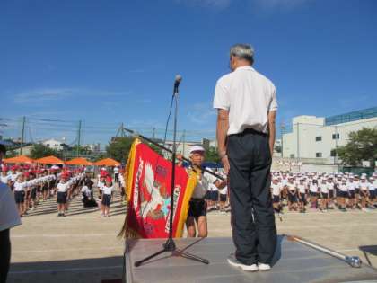 優勝旗返還と準優勝盾返還です。6年生の代表委員が、赤組代表白組代表として、堂々とした姿でとても立派でした。