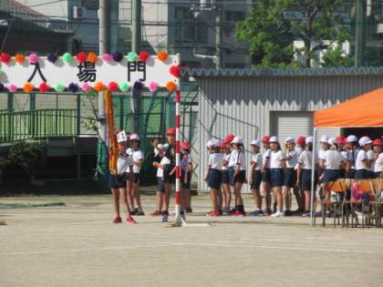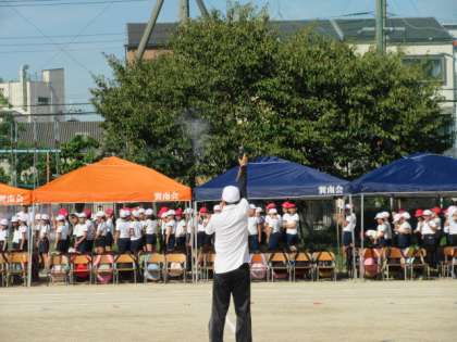 全校児童による入場行進が始まるところと、阪口先生が開会式の始まる合図をしているところです。