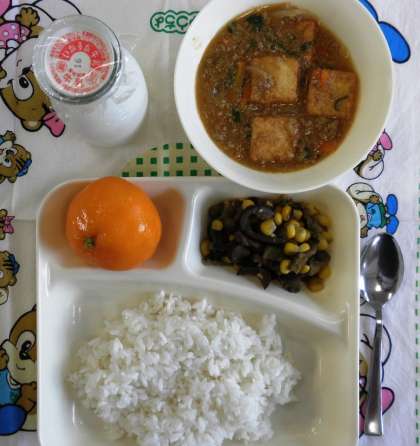 トマトのマーボーあつあげ、ゴーヤととうもろこしとなすのガーリックソテー、みかん(冷)、ご飯、牛乳