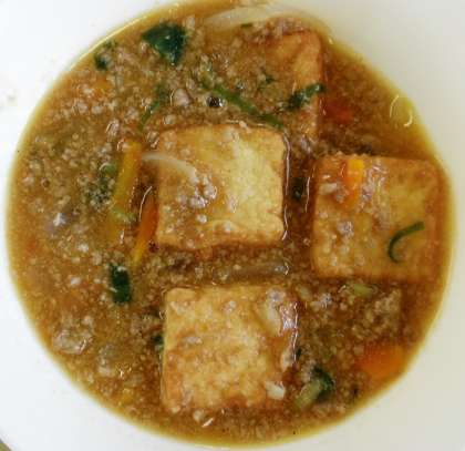 豚挽肉、牛挽肉、あつあげ、トマトを使った味噌味の炒め煮です。