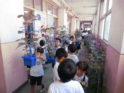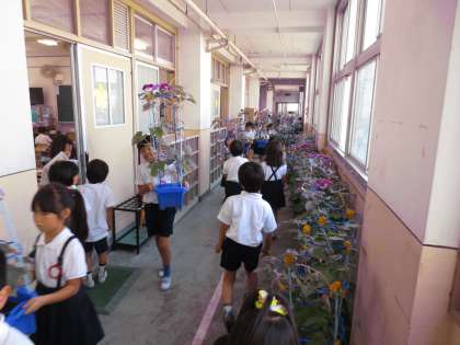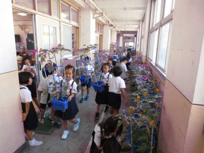 台風が去り、教室の前に避難していたアサガオを、日のあたる運動場に運んでいます。子どもたちは、自分で育てたアサガオをとても大切にしています。