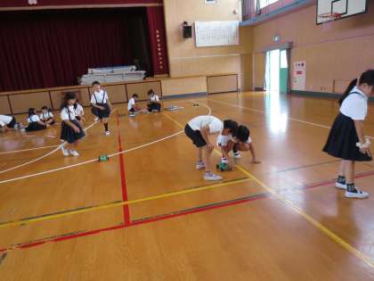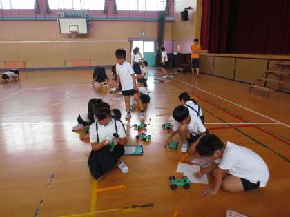 ゴムの力と車が走る距離を調べています。楽しみながらも一生懸命に、グループで調べています。