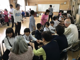 1年生とお年寄りが交流を深められる楽しいゲームをしました。みんなで円になり、手遊びや、服を順番に回していき、最後の人が順番に着ていって、一つの衣装が出来上がる楽しいゲームをしました。とても楽しい雰囲気でふれあいを深めることができました。