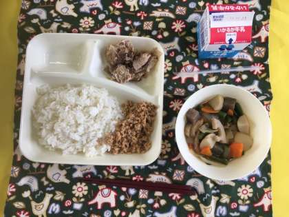 豚肉のねぎしょうゆ焼き、ふきよせ煮、ツナ大豆そぼろ、ご飯、牛乳