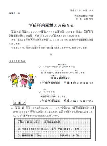 就学時健康診断に伴う下校時刻変更のお知らせ