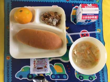なすのミートグラタン、鶏肉と野菜のスープ、みかん、コッペパン、いちごジャム、牛乳