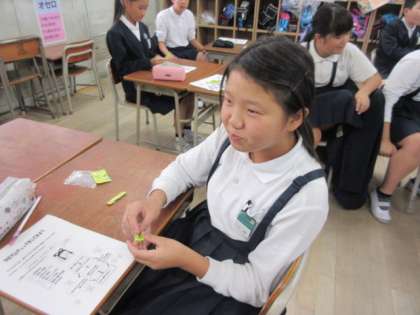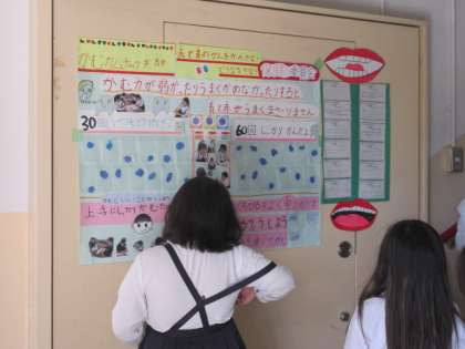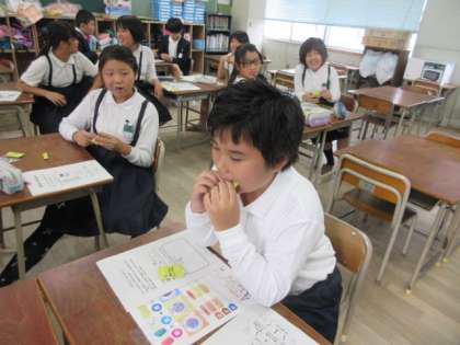 赤と青のガムをかんで、色の混ざり具合をチェックします。