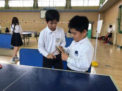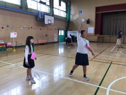 6年1組はミニスポッチャです。卓球、バドミントン、バスケットボールなど時間内で色々なスポーツに挑みます。