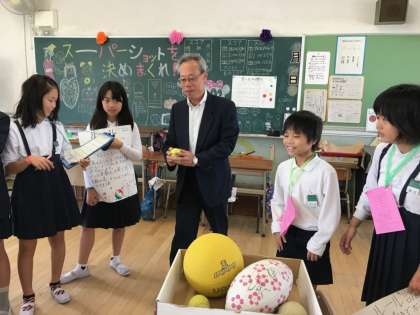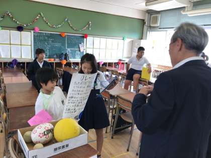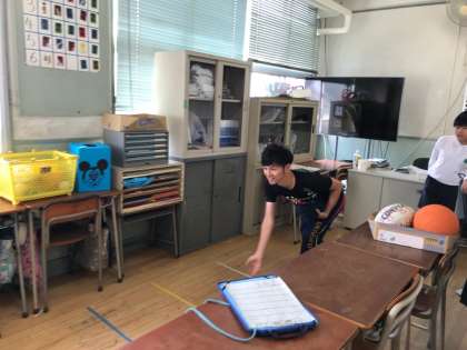 校長先生もテニスボールでボーリングにチャレンジしています。