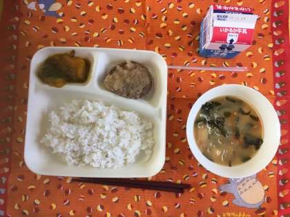 和風おろしハンバーグ、みそ汁、かぼちゃのいとこ煮、ご飯、牛乳