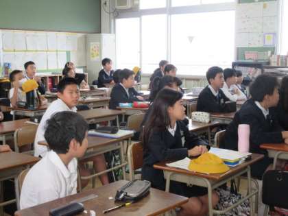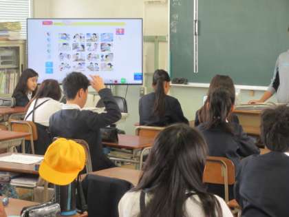 6年1組の様子です。絵を見て何をしているところか英語で答えています。