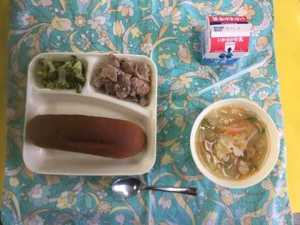 豚肉のガーリック焼き、マカロニと野菜のスープ、カリフラワーのサラダ、黒糖パン、牛乳