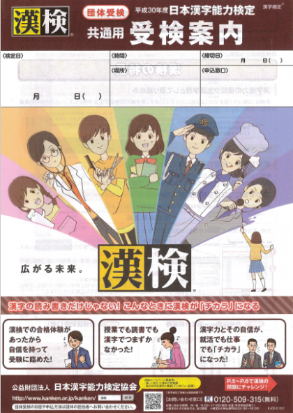 漢字検定は、ご家族(保護者・中学生・高校生等)も参加できます。申込用紙もコピーして同じものを使用して下さい。漢検はご家族で漢字に興味をもつよい機会です。多くの方が漢字にチャレンジされることを期待しております。(巽南小学校卒業生も可)
