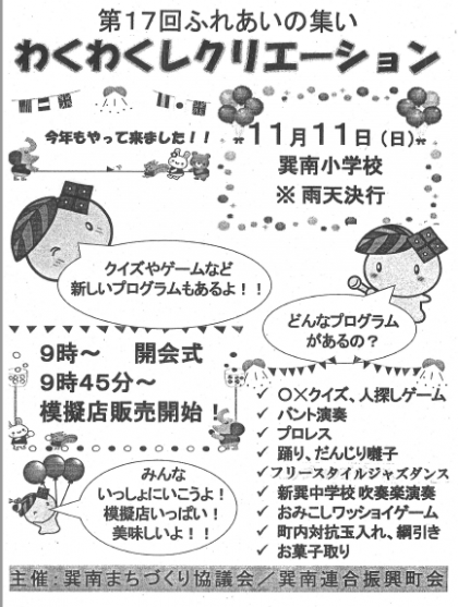 巽南まちづくり協議会 巽南連合振興町会の主催による「巽南わくわくレクリエーション」が、明後日の11日(日)9:00〜15:30 巽南小学校で開催されます。夢と希望にあふれる巽南のまちづくりをめざして!をテーマに、競技、演技、模擬店など、とても楽しい集いです。右記の配布文書にご案内を載せています。ご覧いただき、多くのご参加をよろしくお願いいたします。