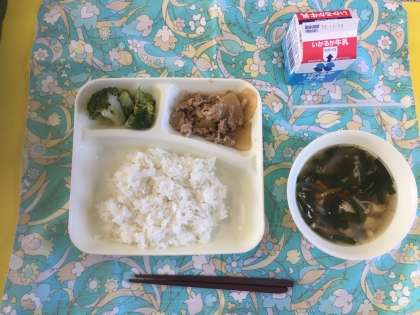 豚肉のコチジャンいため、もずくのスープ、ブロッコリーのナムル風あえもの、ご飯、牛乳