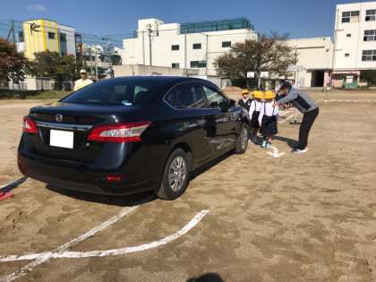 PTAの方などの協力で1年生は2人ペア、2年生は1人ずつ、運動場の模擬コースで歩き方を実践しました。