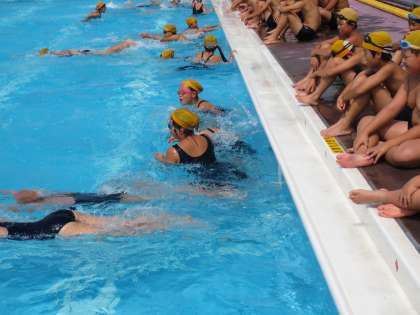 水泳の基本の動きをくりかえし練習しています。