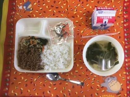 牛挽肉、豚挽肉をにんにく、ごま油、砂糖、料理酒、こい口しょうゆ、コチジャンで炒めた肉みそと、だいこん、ほうれん草などの野菜のあえものと一緒にご飯にかけていただきます。児童に人気の献立です。