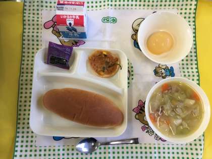 豚肉と野菜のスープ煮、変わりピザ、白桃(缶)、コッペパン、ブルーベリージャム、牛乳