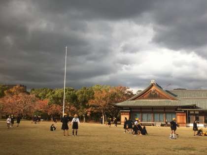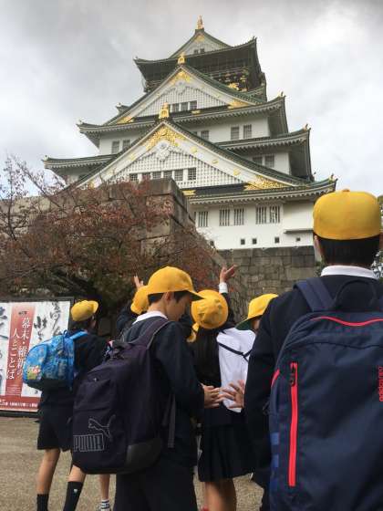 次は大阪城です。1階から8階までの博物館を階段で上って見学しました。そして天守閣から大阪の街を眺めました。その後は、お弁当を食べるはずだった西の丸庭園に入って遊びました。みんな元気よく走り回っていました。写真の雲行きを見てもわかるように、帰り道は大雨でした。1日中良く歩いてよく勉強できた1日でした。