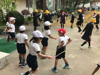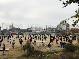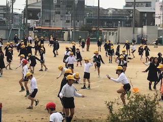 子どもたちは、一斉になわとびを持って運動場に