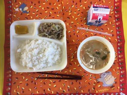 豚肉とまいたけのいためもの、つみれ汁、かぼちゃういろう、ご飯、牛乳