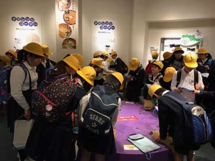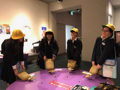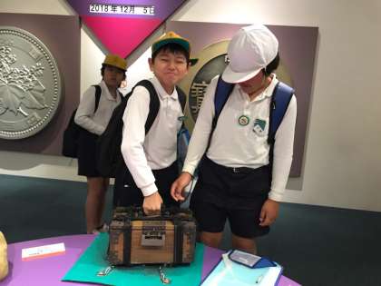 博物館には昔、小判が入れられていた千両箱などが展示されていて、みんなはその重さを実際に体験していました。