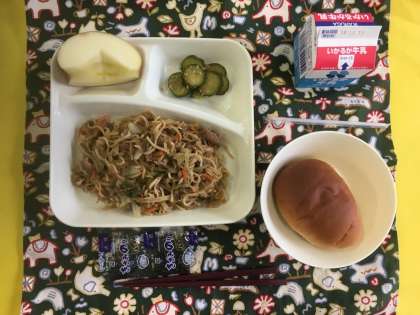 オイスターソース焼きそば、はくさいのスープ、りんご、黒糖パン(小)、牛乳