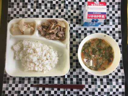 豚肉のしょうが焼き、田辺大根のみそ汁、田辺だいこんの煮もの、ご飯、牛乳