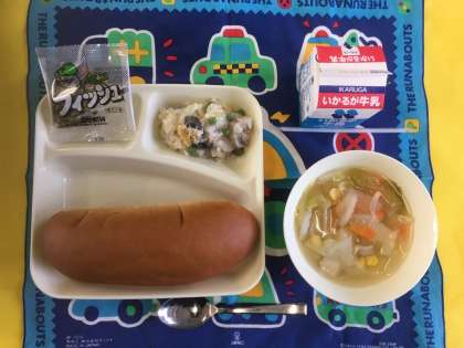 鶏肉とじゃがいものスープ煮、きのこのドリア、ミニフィッシュ、黒糖パン、牛乳