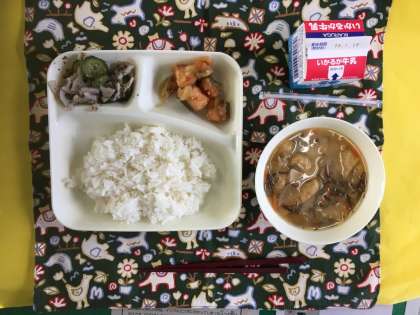 うすあげ、だいこん、にんじん、もずく、の入ったみそ汁のです。平成29年度学校給食献立コンクール優秀賞献立です。