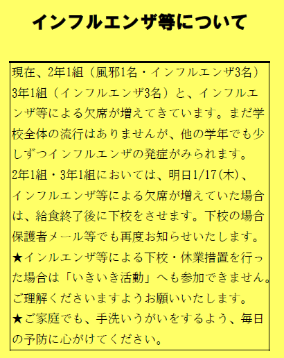 2年1組・3年1組においては、明日1/17(木)、インフルエンザ等による欠席が増えていた場合は、給食終了後に下校をさせます。下校の場合は、保護者メール等でも再度お知らせいたします。