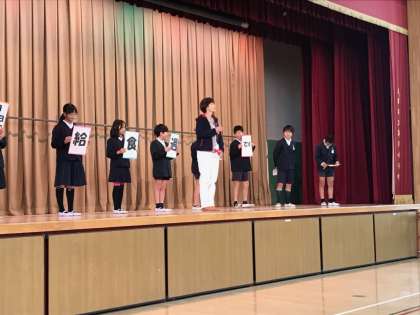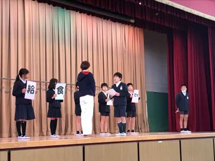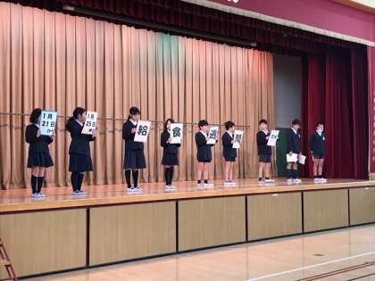 今日の集会では、給食委員会の人たちが21日から始まる巽南小学校の給食週間について話がありました。
